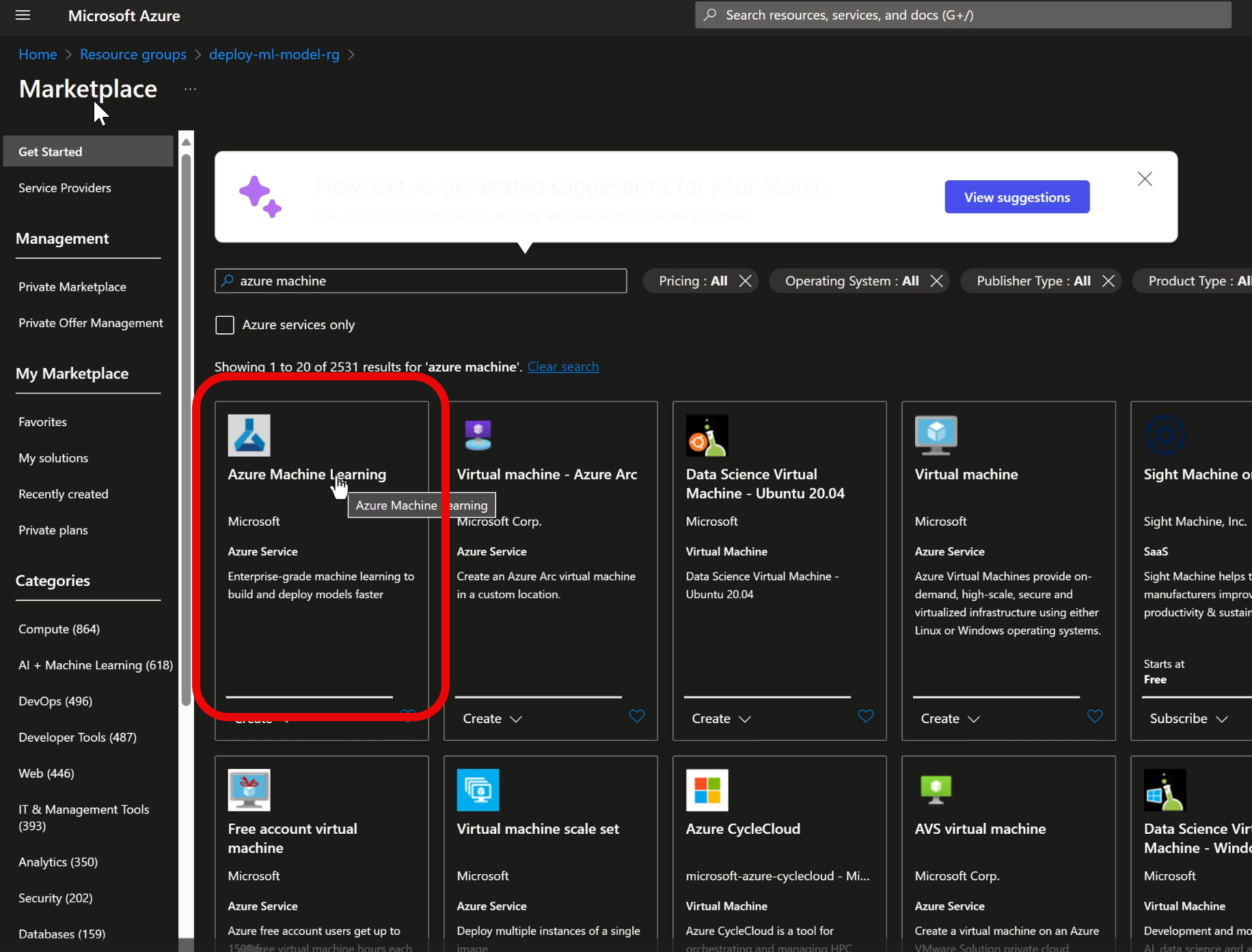 To use the Azure Machine Learning Model Catalog, we'll first need an Azure Machine Learning workspace. To create a workspace, we'll add a new Resource Group, and then create an Azure Machine Learning service within the resource group.