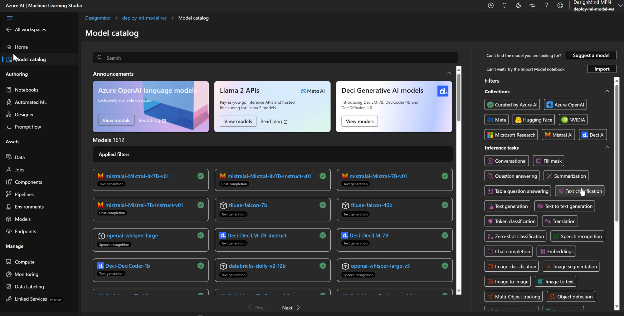 Once in the Azure ML Studio, we can browse the model catalog and select a model that meets our needs. Each model has summary information, and links to the originator of the model we can follow to learn more about each one.