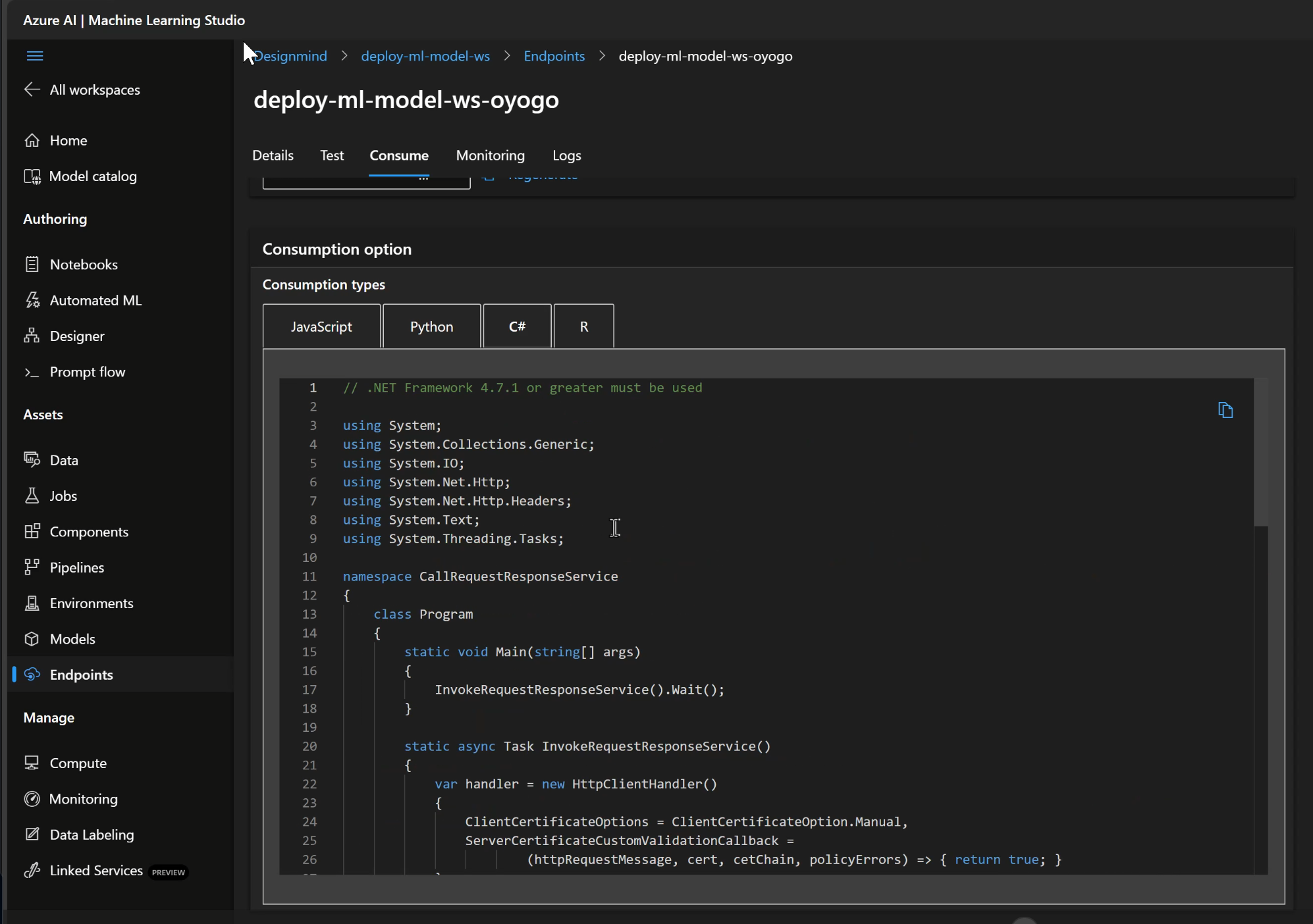 Within the Azure ML Studio, sample code is provided in JavaScript, Python, C# and R to get us started.
