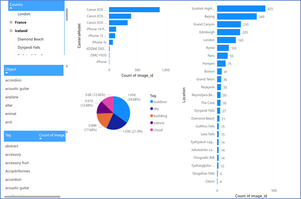 With the AI enriched data read into the data model, we can use Power BI's powerful visualization tools to analyze the photo library quantitatively, using cross-drill across AI and non-AI generated metadata.