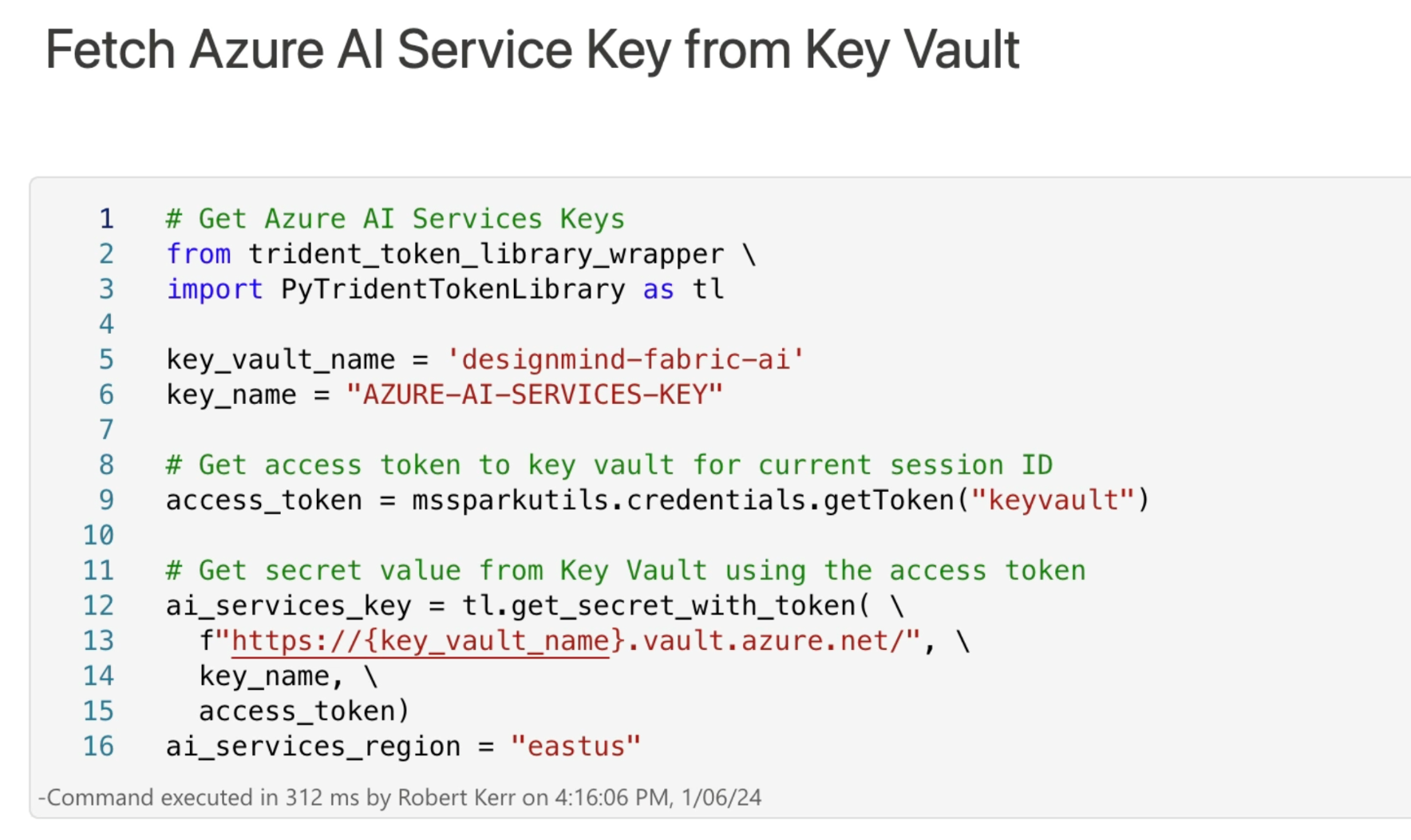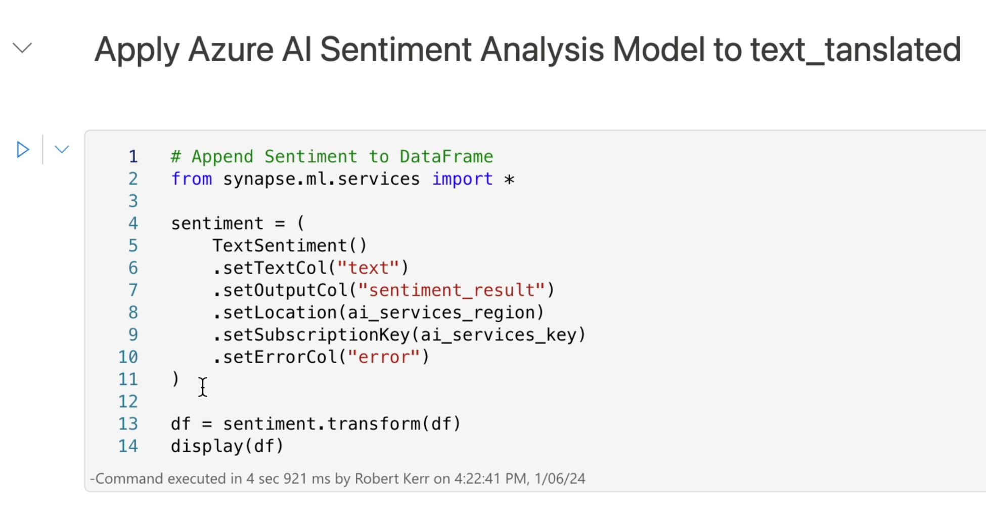 The sentiment analysis transformer requires a key to use the Azure AI Service. When using secret keys in notebooks, we don't want them in the notebook source code, and as a best practice store them in Azure Key Vault.