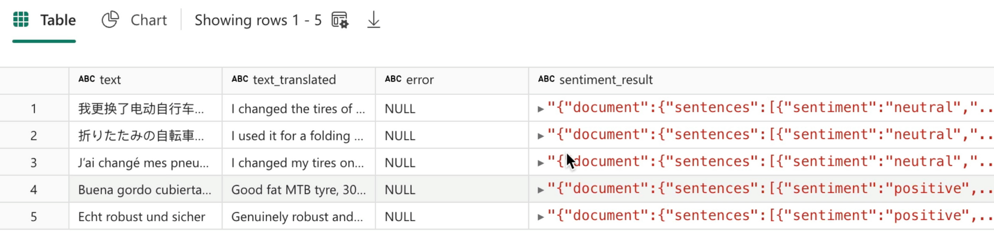 The sentiment_result column is a JSON object, that contains a wealth of information, including confidence, sentiment of sub-sections of text, and an overall sentiment evaluation.