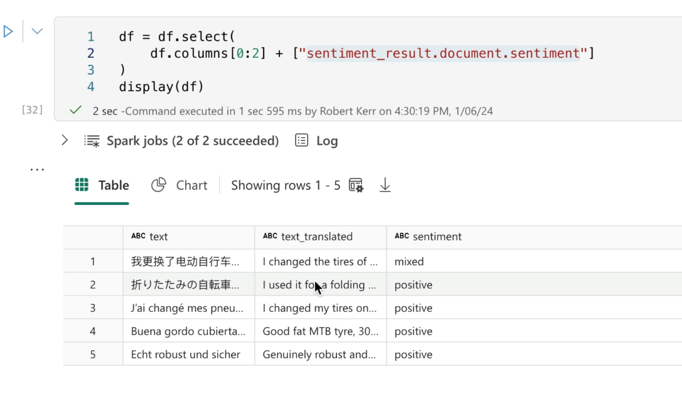From a Fabric Jupyter Notebook, we can also access Azure AI Sentiment analysis by using the pre-installed Synapse ML libraries. In this post we'll use this Synapse ML library to apply sentiment analysis to each row of a Spark DataFrame according to the sentiment of user review content.
