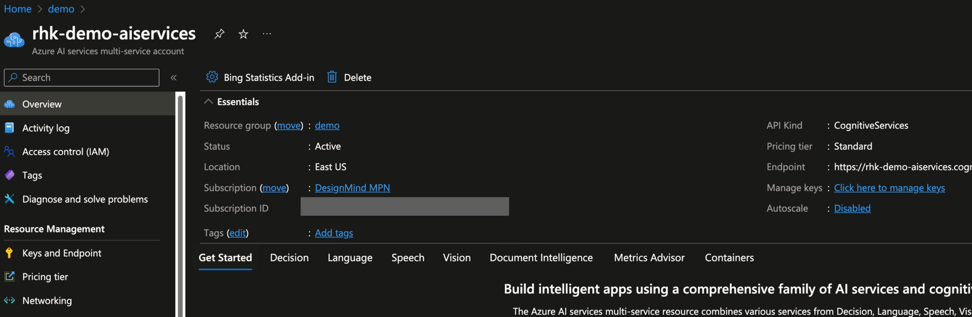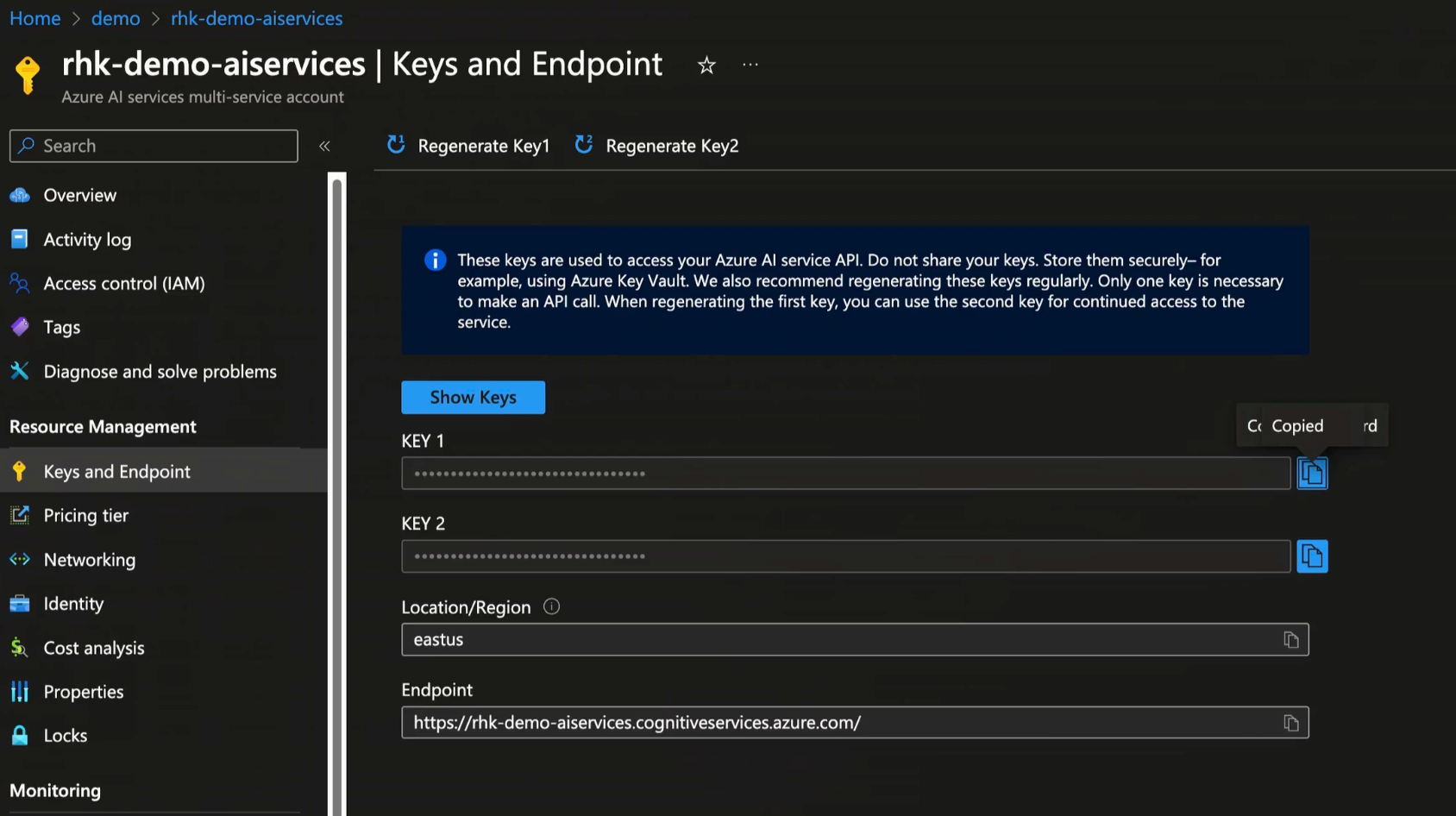 From the Azure AI Service, we need to record the endpoint and one of the KEY values. We'll use these values in Python code in the Jupyter notebook.