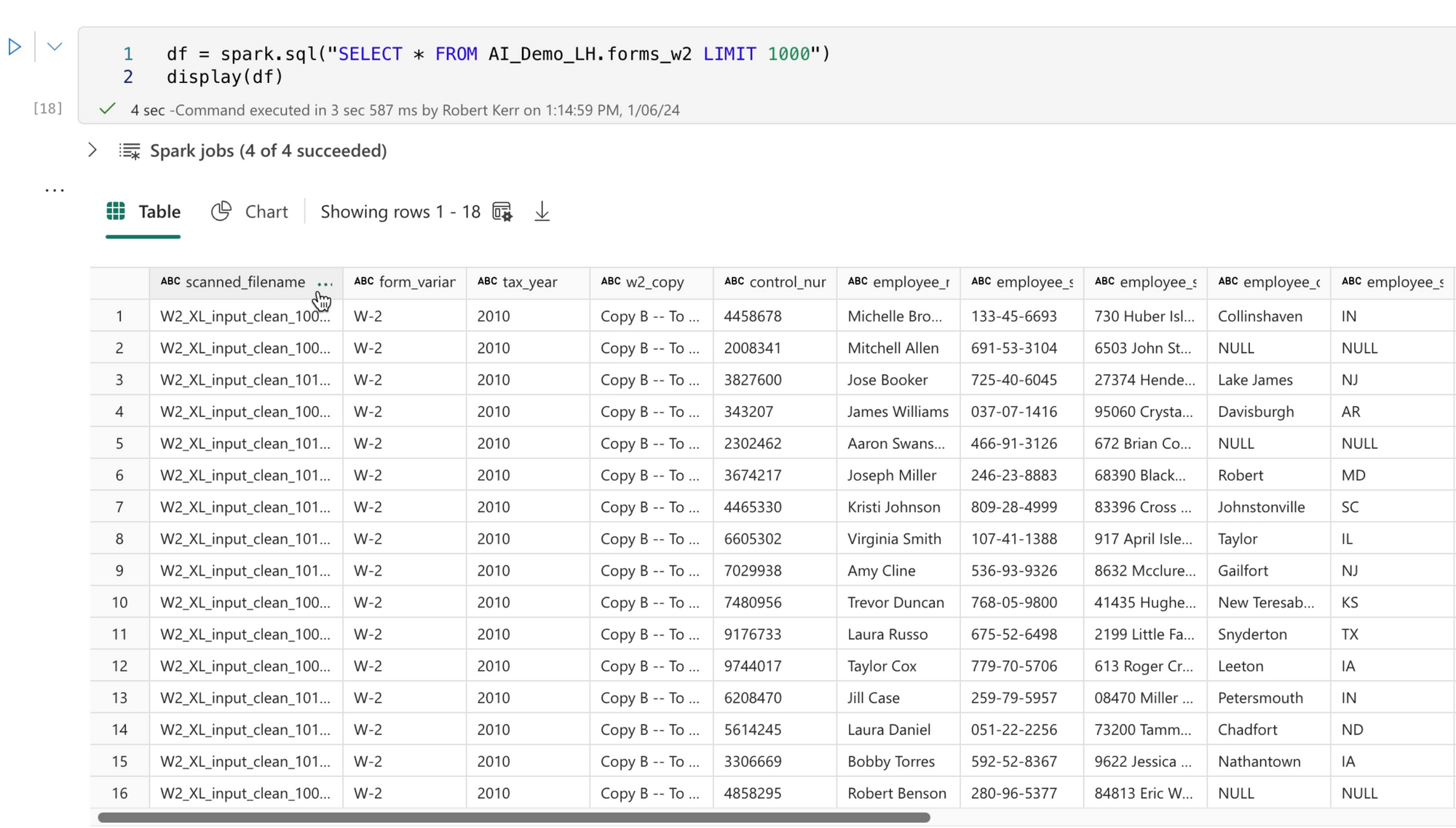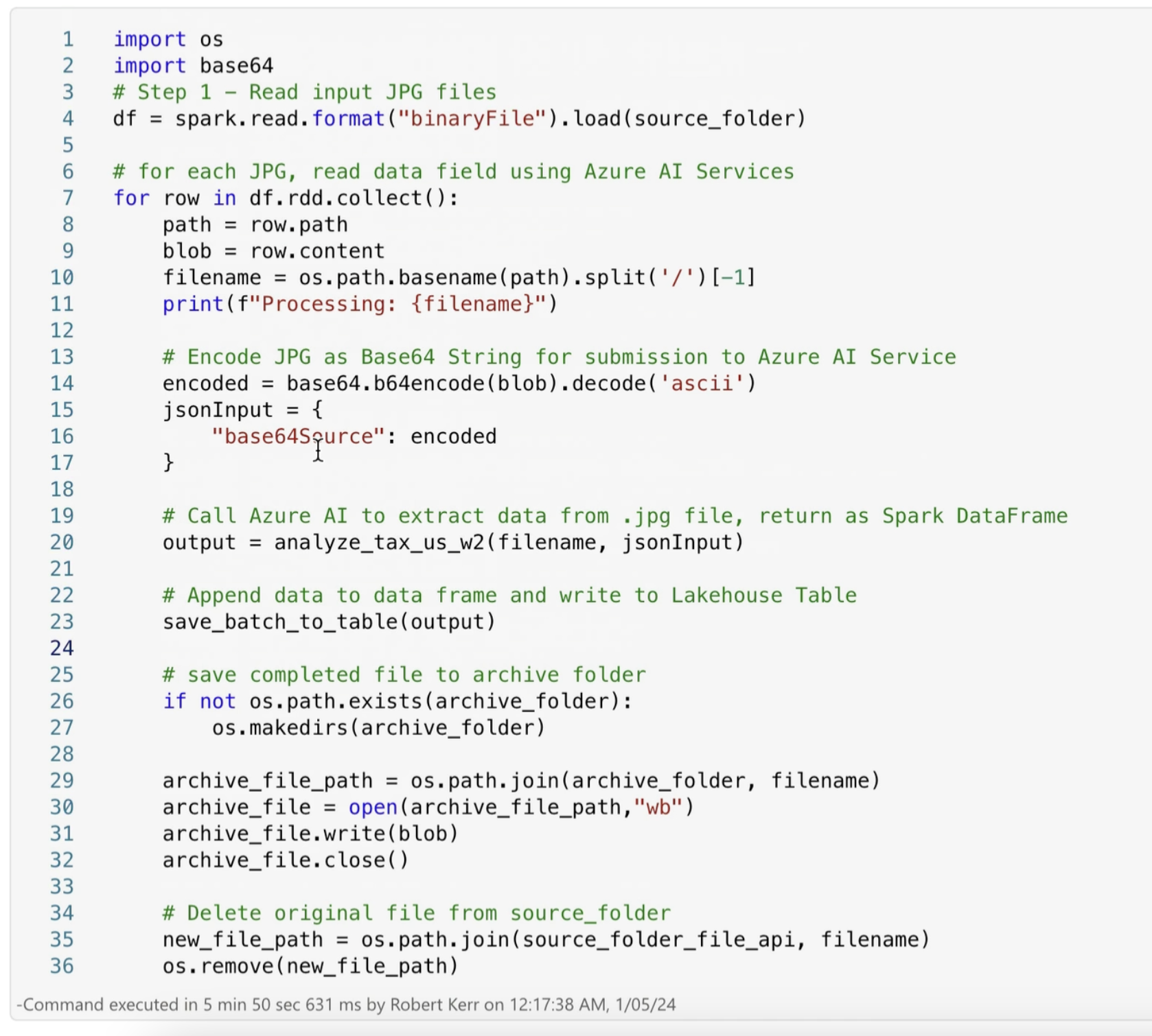 - On line 4, we load all the W-2 document images (which are JPEG files) from the source folder in the Data Lake