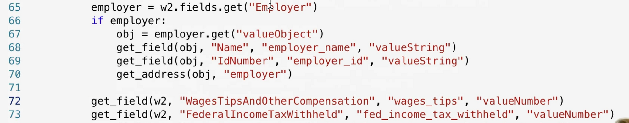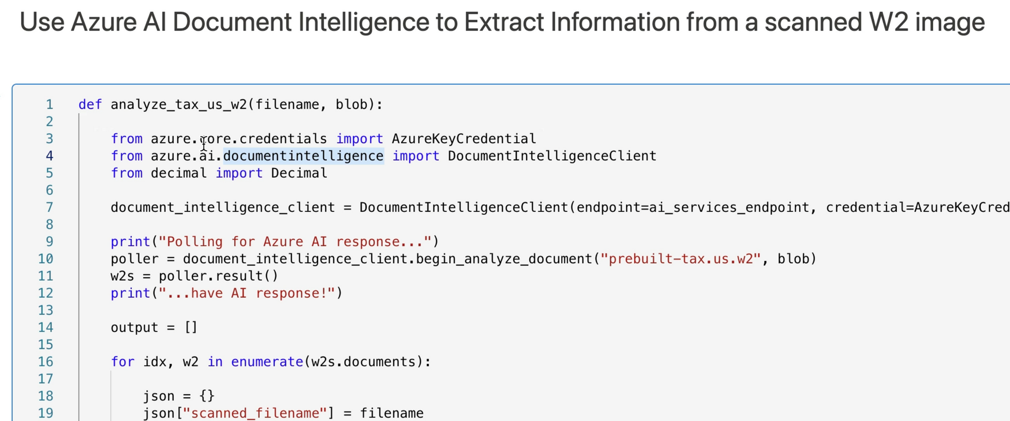 The top art of the analyze_tax_us_w2 function makes the call to Azure AI in lines 7-11. There's a lot going on in three lines of code: