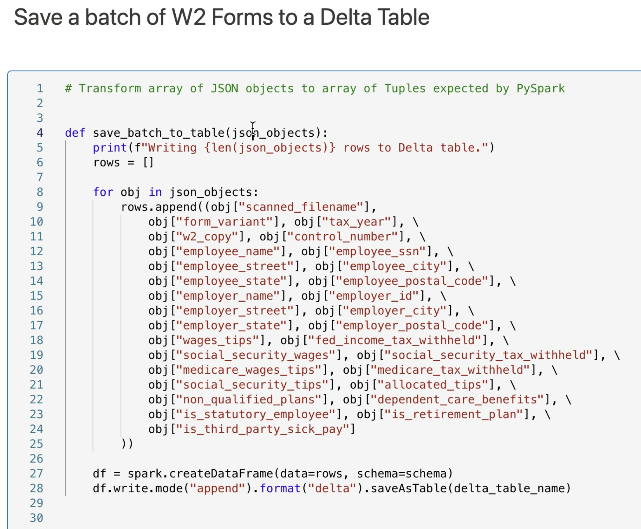 When the response is parsed into a row format, the main loop calls our save_batch_to_table function to write the data extracted from the JPEG form to a Delta Table in the Data Lake.