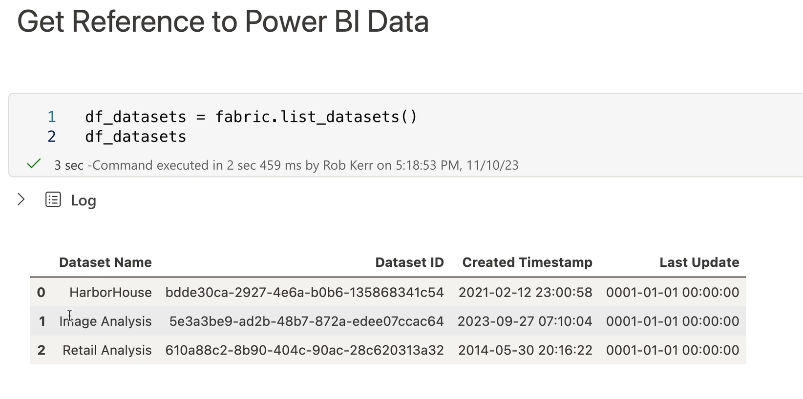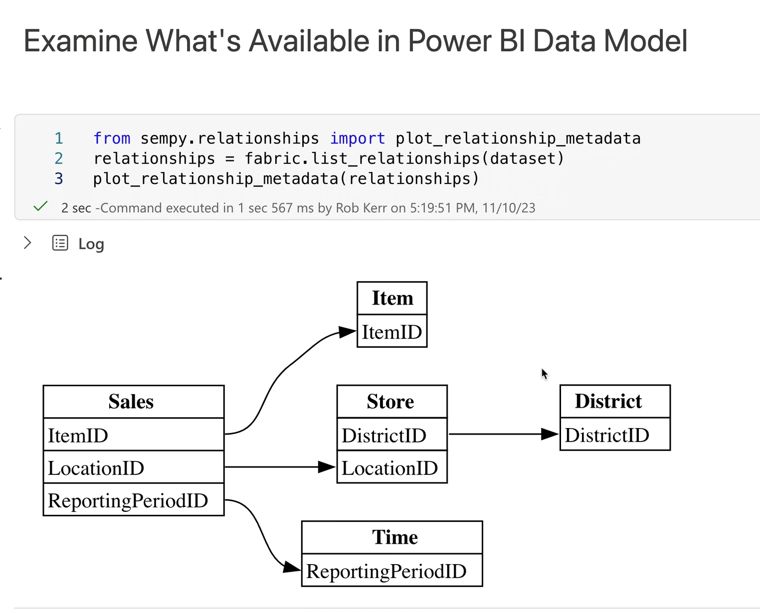 While our main interest in this example is extracting data from the Power BI data source, we can also use the fabric object to inspect the data model, list measures, and even make changes to the data model.