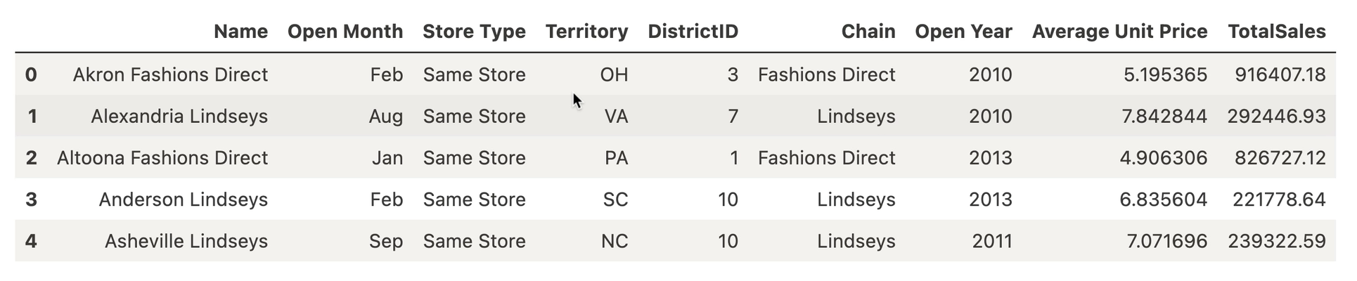 In this case, we'll select TotalSales as the metric to predict with a regression model, a set of categorical metadata about stores, and another metric Average Unit Price to use as the independent variables in the regression analysis.