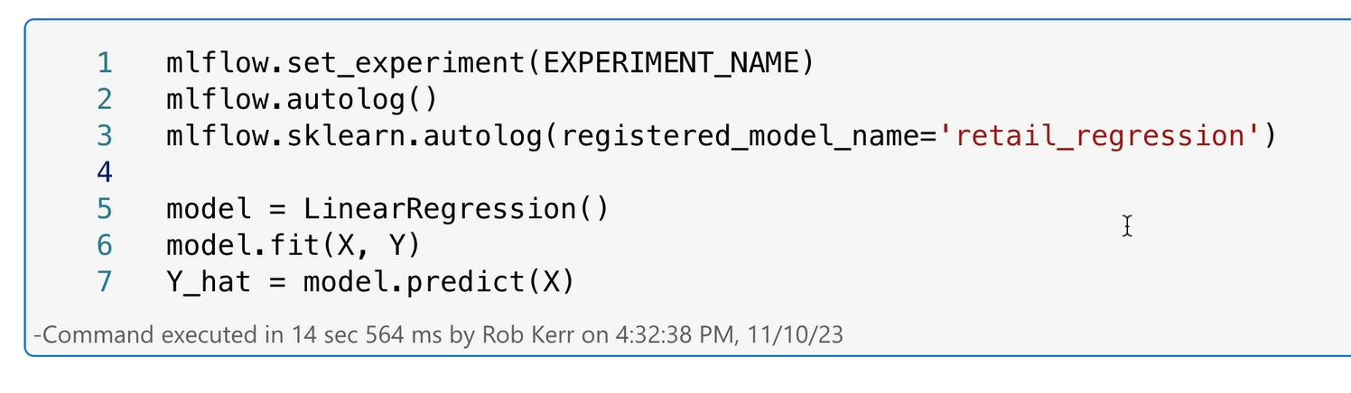- Switch on MLflow autolog, which will automatically log metrics to Fabric data science for documentation and later review (line 3)