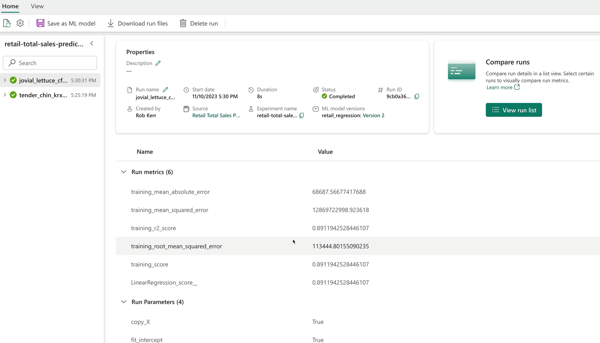We can then return to Fabric and review the experiment, the run we did, and the performance of the resulting model.
