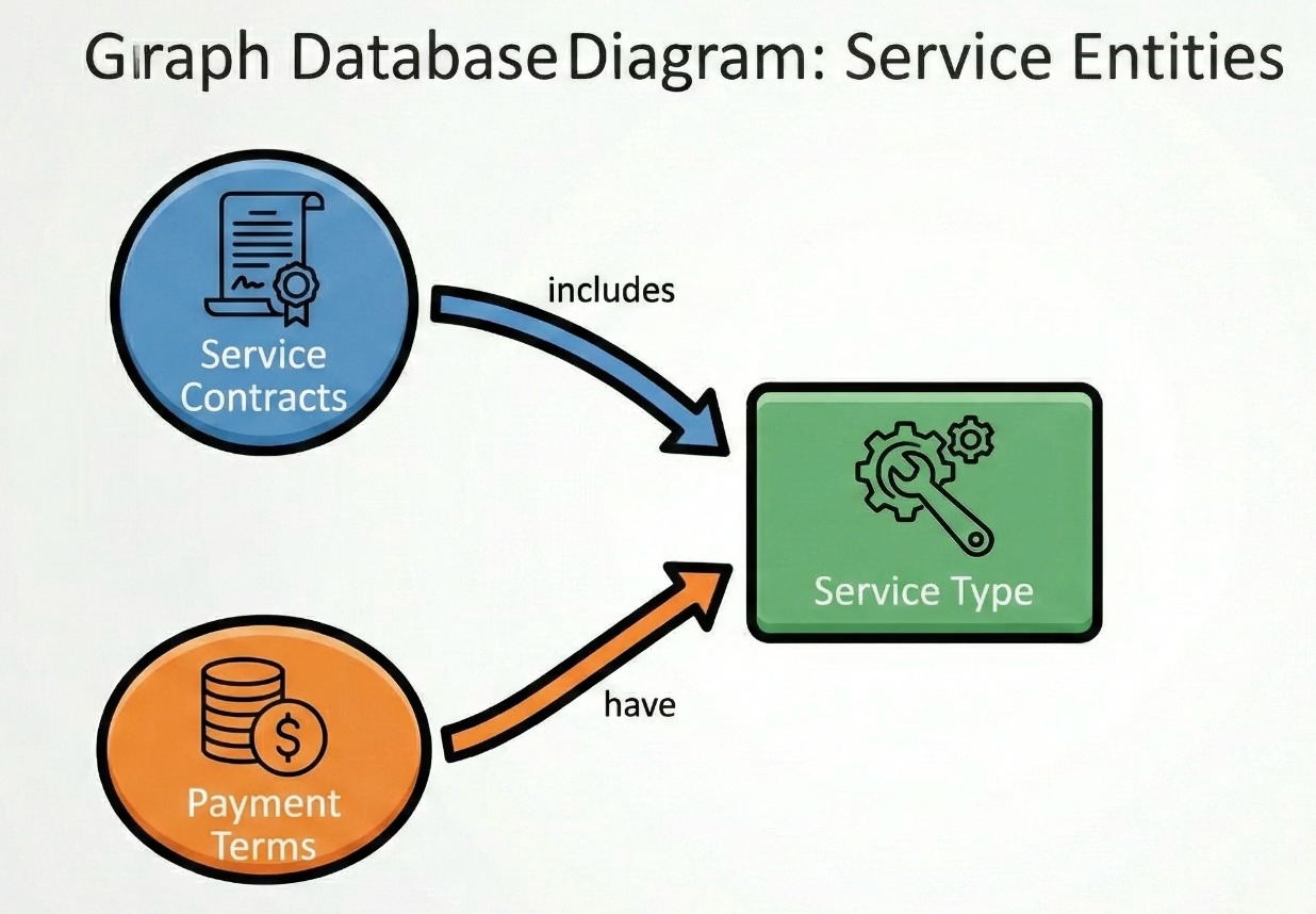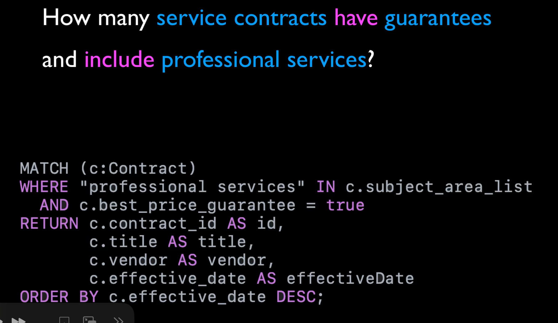 Think about a user asking how many service contracts have best price guarantees and cover professional services. If our graph database stored “contract” and “professional services” as entities and and “best price guarantee” as a contract attribute, we could easily pull a list of contracts where the subject area list includes “professional services” and the “Best price guarantee” property is true.
