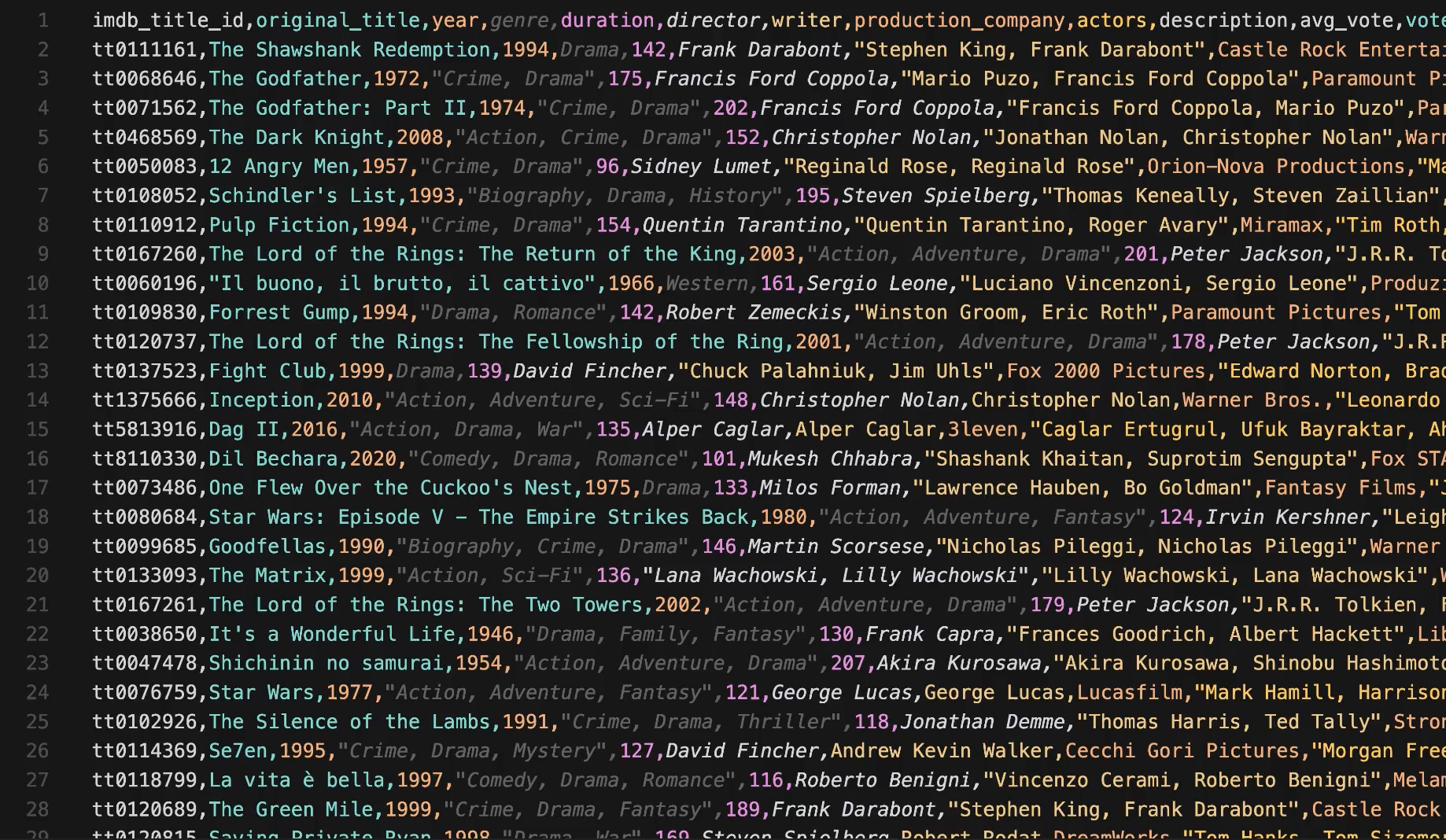 I’ll be using this sample data file of 100 movies. It’s a CSV file, and There are actually some one-to-many relationships in here—for example a movie can have multiple actors and genres. We’ll capture those relationships when we load the data into the graph database.