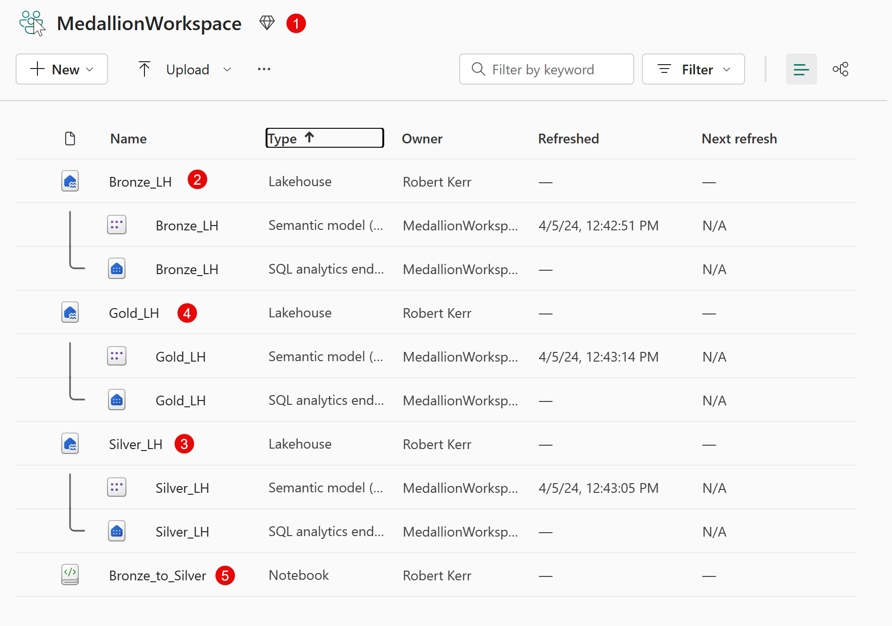 MedallionWorkspace, that contains my entire solution. - Lakehouse named