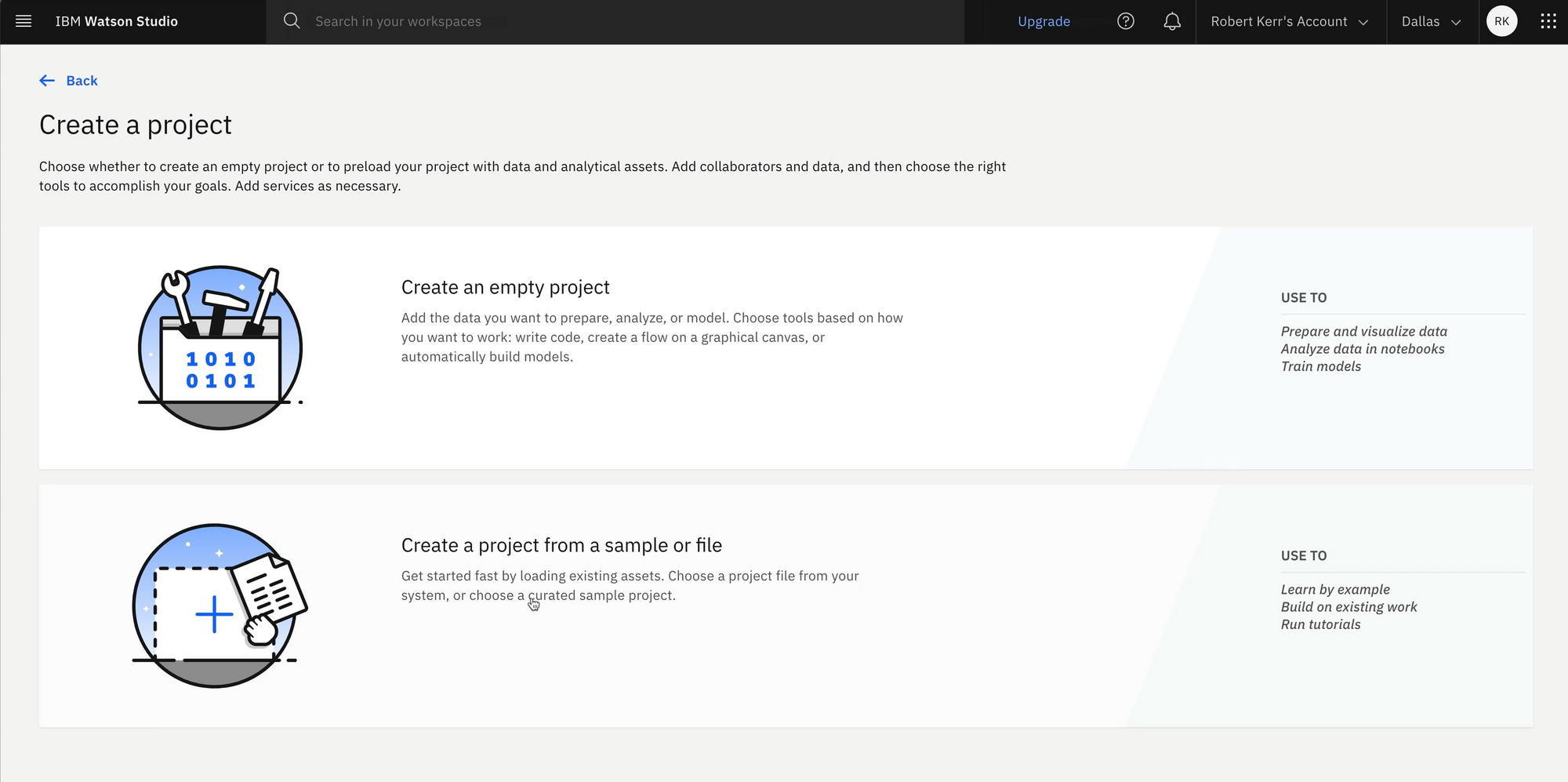 Watson Studio is project based, so the first step in training a model is to create a project to hold all the assets. In this simple case, the assets include: