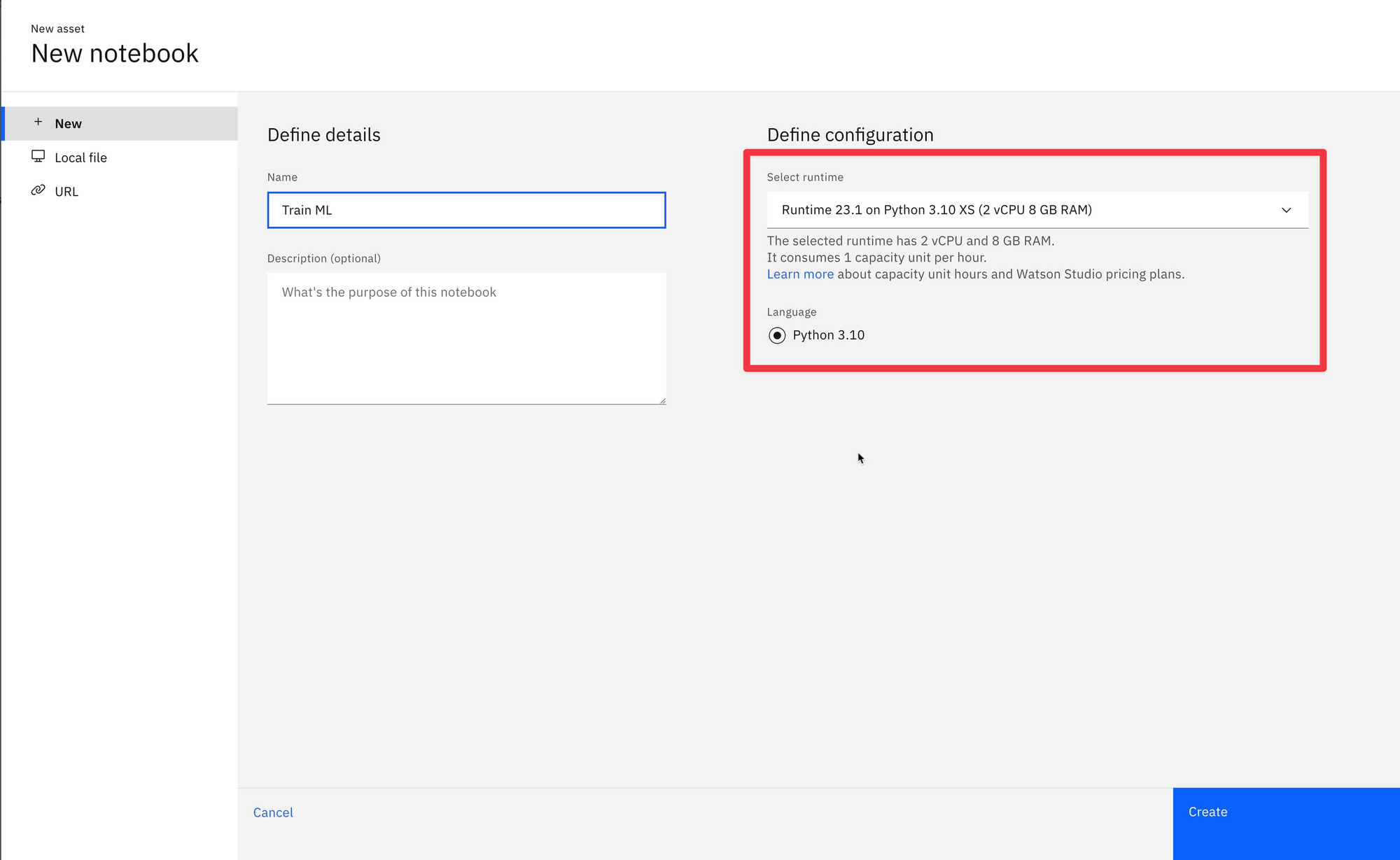 As the notebook is created, Watson Studio provisions a compute kernel, and automatically attaches it to the notebook. As with most cloud platforms, there's a choice of runtime virtual machine specs, dependin gon the processing needs of the model.