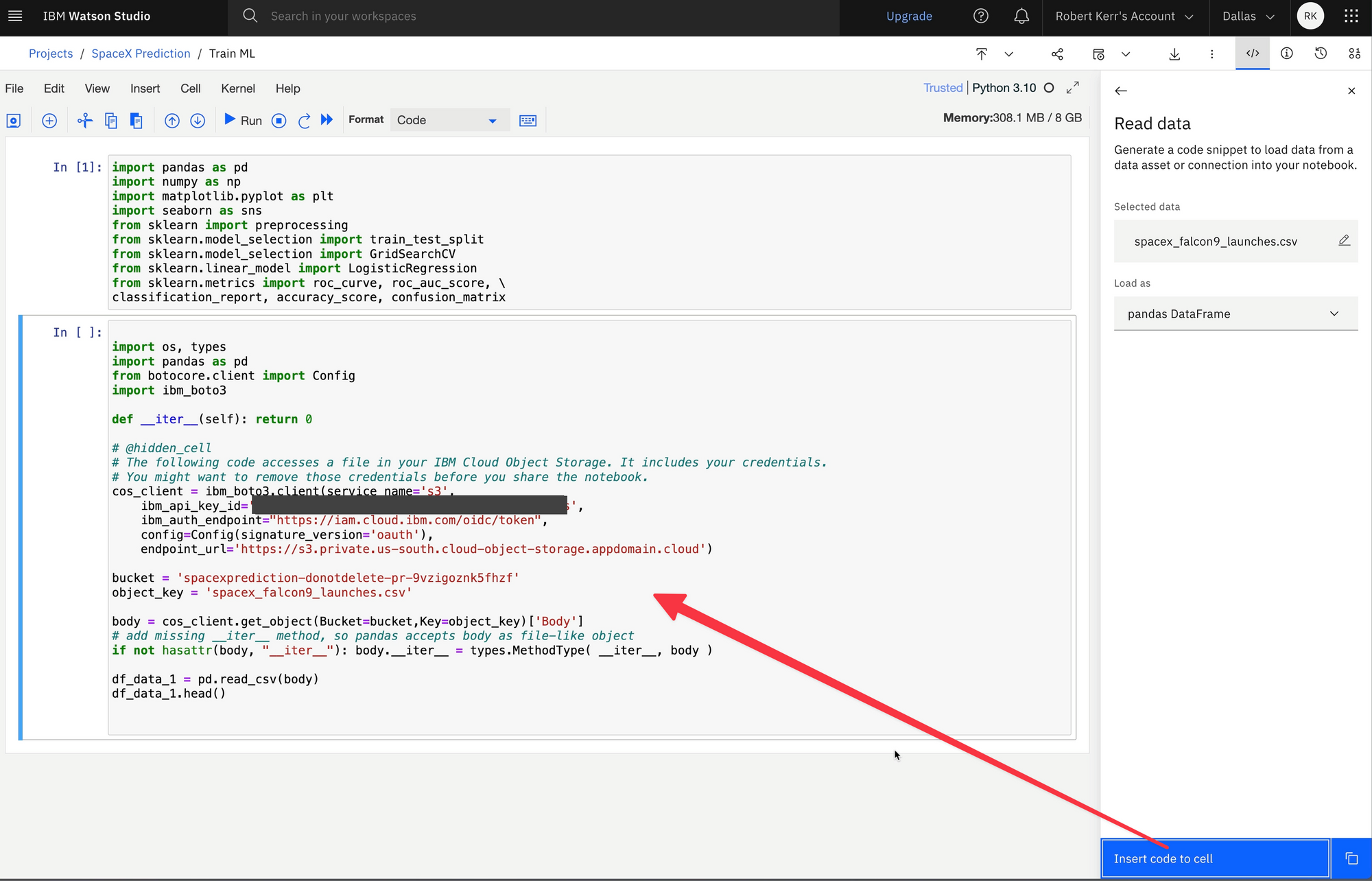 The uploaded data file is in a storage bucket. Code & Credentials are needed to access the data file. Luckly Watson Studio provides a code snippet generator, which can insert the correct, completed code into the notebook.